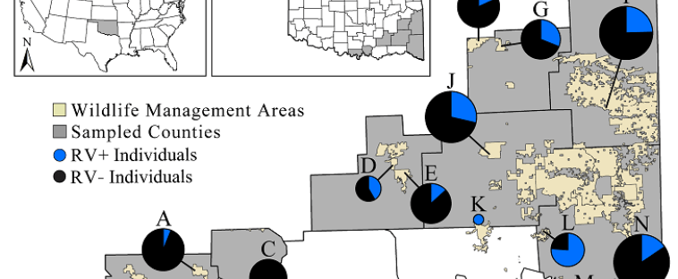 Several infectious diseases are threatening amphibian species worldwide and have resulted in mass-mortality events across the globe. An emerging group of viral pathogens (ranaviruses) are documented to cause die-offs in amphibian populations worldwide, including in several regions of the U.S. Unfortunately, large gaps remain in our understanding of the distribution of this systemic pathogen in the U.S., including within the state of Oklahoma. To address this gap in our understanding, we carried out surveys of this infectious pathogen across 14 sites in seven southeastern Oklahoma counties in spring 2015, screening 17 amphibian species from this region. Using liver and tail tissue samples collected from individual amphibians, we screened for the presence and infection load of ranavirus. Of the 390 samples, 84 (21.5%) tested positive for ranavirus, with infection prevalence varying among species surveyed. Notably, the family Bufonidae had no samples that tested positive for ranavirus, whereas the remaining families had an infection prevalence ranging from 14–50%. Despite an overall infection prevalence of 21.5%, we detected no clinical signs of ranavirosis and all sampled individuals appeared outwardly healthy. These results provide data on the geographic and host distribution of ranavirus in southeastern Oklahoma, as well as the first documented cases of the pathogen in three species of anurans: Gastrophryne carolinensis (Eastern Narrow-mouthed Toad), G. olivacea (Western Narrow-mouthed Toad), and Pseudacris fouquettei (Cajun Chorus Frog). With widespread ranavirus infection, there is potential for transmission from abundant, widespread species to more vulnerable, state-threatened amphibians.